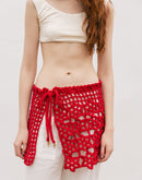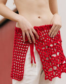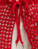 Pareô com amarração na cintura. Confeccionada em crochê feito à mão, ponto vazado e estruturado em formato de flores e tela.